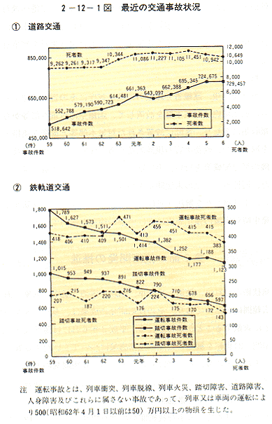 - 道路交通事故による年間の死者数が昭和63年以降7年連続で1万人台を記録し、依然としてきわめて厳しい状況にある(平成6年の交通事故死者数10,649人)。