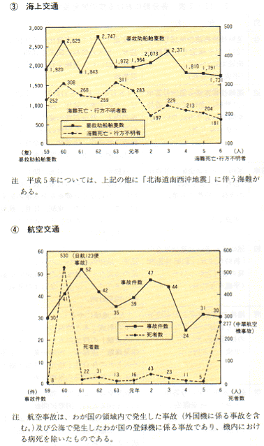 海上交通においても事故は減少傾向にある(平成6年の死亡・行方不明者数181名)。ただし、この中で、プレジャーボート等の海難件数は長期的には活動の活発化に伴ってむしろ漸増傾向にあり、全要救助船舶隻数に占めるの割合も高くなっている(6年においては全要救助船舶隻数のうち35%)。
