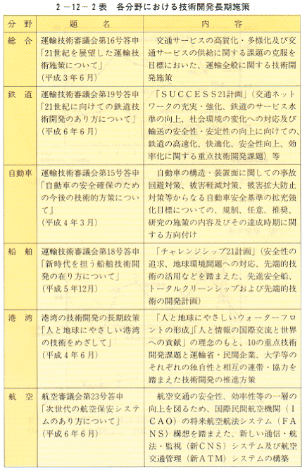 運輸技術の分野は、鉄道、自動車、船舶、港湾、航空、気象、海上保安等広範囲にわたっており、その技術開発の成果は、多くの人々の生活の向上に貢献することが期待される。平成3年6月には運輸技術審議会より諮問「21世紀を展望した運輸技術施策について」に対する答申が出され、また、その後、各分野においても今後の技術開発の方向性を示す各種答申が出されている。運輸省では、今後も引き続き、同答申の内容に沿って運輸技術施策を推進することとしている。