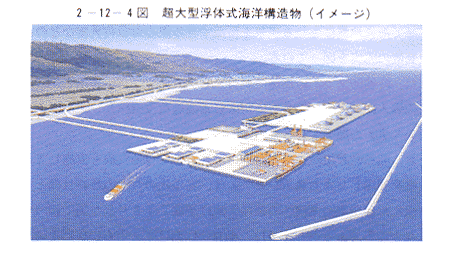 - 造船技術の高度化、海上輸送の効率化等のため、造船業基盤整備事業協会を通じ次世代船舶の研究開発として、現在、超大型浮体式海洋構造物(メガフロート)〔2−12−4図〕、テクノスーパーライナー及び新形式舶用電気推進システムの研究開発を推進している。メガフロートは、利用需要の増大が見込まれる沖合域に新たな人工地盤を提供する超大型(数キロメートル規模、耐用年数100年)の浮体式海洋構造物であり、今後の運輸関連施設等の大規模な社会資本の整備に当たり従来の工法を補完するものとして期待されている。テクノスーパーライナーは、航空機やトラックよりも大量の貨物(積載重量1,000トン)を従来の船舶の2倍以上の高速(速力50ノット)で輸送することができ、トラック輸送から海上貨物輸送へのモーダルシフトの推進に貢献することが期待される新形式超高速船である。さらに、造船業基盤整備事業協会において、地球環境問題に対処するため、環境保全技術の研究開発として、新形式タンカー構造等の油流出防止技術及び排気ガス浄化技術の研究開発を推進している。
