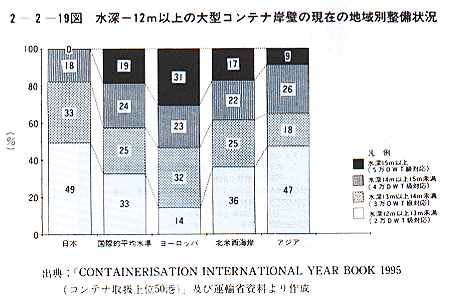 - アジアの主要コンテナ港湾においては水深15m級の高規格のコンテナターミナルが既に利用されているにもかかわらず、我が国においては未だ同規模のターミナルがないことが、我が国港湾の国際競争力の低下の一因となっている。一方、国際的な相互依存関係の高まる中、国際海上コンテナ貨物量、特に輸入貨物が急増している。これらに対応するため、国際海上コンテナターミナルの整備を東京湾、伊勢湾、大阪湾を始め19港で行っている。また、埠頭公社のターミナル整備に対して、港湾料金の低減による港湾の国際競争力の強化を図るための無利子貸付の拡充を行っている。