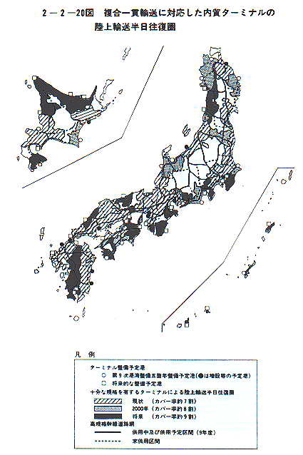 また、海・陸の複合一貫輸送の進展に対応した内貿ターミナルの整備を進め、港への陸上輸送半日往復圏の割合を向上させるほか〔2−2−20図〕、背後圏とのアクセス向上のため、臨海部の道路網の充実を図る。さらに、TSL(テクノスーパーライナー)に対しては、実用化の状況を睨みつつ、その高速性を生かすことのできる所要の施設整備を行う。