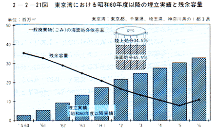 一般廃棄物の最終処分のため、海面処分場を計画的に確保する。東京湾(東京、千葉、埼玉、神奈川の1都3県)においては廃棄物の3分の2を受け入れており、残余容量の逼迫している東京湾の処分場や〔2−2−21図〕、阪神・淡路大震災の瓦礫も受け入れた大阪湾フェニックスなどの整備等を推進する。また、首都圏の建設残土を地方の港湾建設に広域活用するスーパーフェニックスを推進するなど、資源の有効活用も図る。