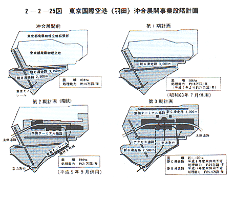 東京国際空港では、全国43空港との間に1日約270便(540発着)のネットワークが形成され、年間約4,100万人が利用している。同空港の沖合展開事業は、将来とも首都圏における国内航空交通の中心としての機能を確保するとともに、航空機騒音問題の抜本的解消を図るため、東京都の造成した羽田沖廃棄物埋立地を活用し、羽田空港を沖合に展開するものである〔2−2−25図〕。本事業においては、全体を3期に分けて段階供用を行うこととしており、第1期については、昭和63年7月2日の新A滑走路供用開始をもって完了した。これによって、滑走路年間処理能力は以前より増大し、その後も順次増便が行われてきている。