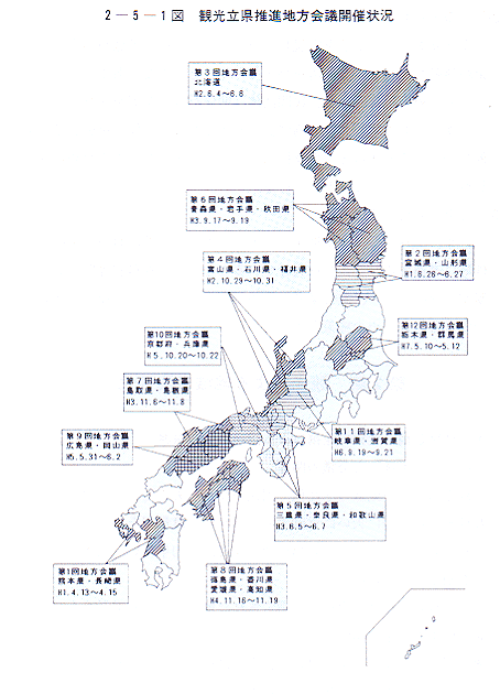観光立県推進地方会議は、これまで12回開催されており〔2−5−1図〕、それぞれの地域の特性を生かした観光振興方策について活発な審議が行われ、会議での提言は、各地域の協議会等フォローアップ推進組織を通して、逐次実施に移されるなどの成果をあげている。