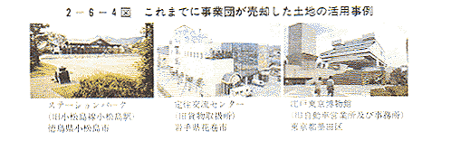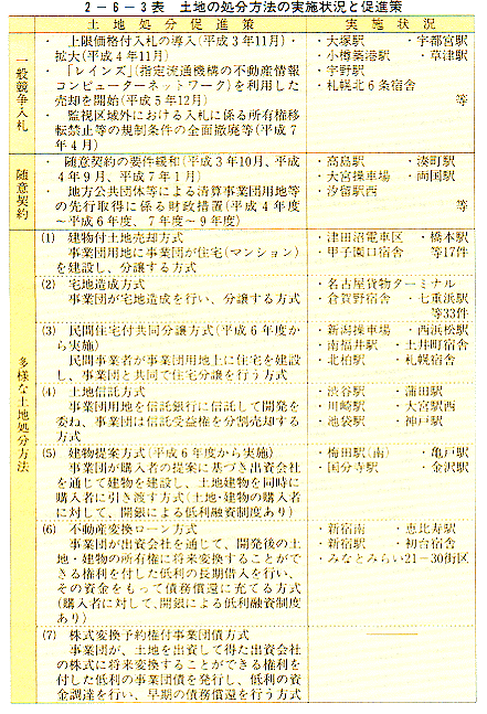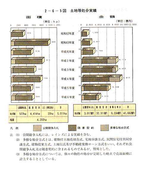 - 事業団の土地の処分については、昨今の経済情勢及び不動産を取り巻く環境が厳しい中で、運輸省・事業団は、「国鉄清算事業団の土地処分推進のためのアクションプログラム」を平成5年10月及び平成6年12月に策定・推進する等あらゆる手段を講じることにより、事業団用地処分の推進に邁進してきた〔2−6−3表〕〔2−6−4図〕〔2−6−5図〕。今後においても、大変厳しい状況ではあるが、9年度までに事業団用地の実質的な処分を終了させるよう最大限努力していくこととしている。
