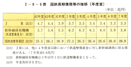 - 国鉄長期債務等の推移は〔2−6−6表〕のとおりであり、JRの債務は順調に減少している一方、事業団の債務等の推移は概ね横ばいの状況が続いている。国鉄改革から8年余りが経過し、改革10年たる9年度が目前であるが、国鉄改革の総仕上げのため、国鉄長期債務等の処理につき、全力を挙げて取り組んでいく必要がある。あわせて、JRの完全民営化、健全な経営に不可欠な経営基盤の確立等を図っていくことによって、国民生活充実のための重要な手段としてのJRの役割と責任を十分に確立していく必要がある。