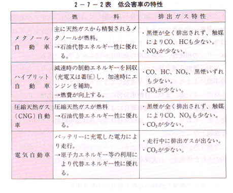 また、国税・地方税の優遇措置をはじめ、日本開発銀行等による低利融資やバス活性化システム整備費等補助制度、運輸事業振興助成交付金を活用した助成措置などの施策を推進している。さらに、7年度から日本開発銀行等による低利融資の対象に新たに圧縮天然ガス自動車・天然ガス充填設備及び蓄圧式ハイブリット自動車を加えるとともに、バス活性化システム整備費等補助制度による低公害バスの導入対象地域を自動車NOx法の特定地域のほか、国立公園等のマイカー規制地域にも拡大したところであり、これにより上高地にハイブリットバス(4台)、富士山にCNG(圧縮天然ガス)バス(2台)の導入が図られたところである。