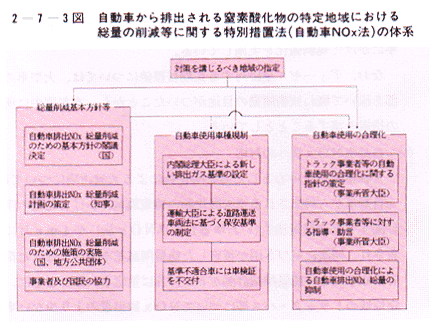大都市地域を中心とした窒素酸化物による大気汚染については、「自動車から排出される窒素酸化物の特定地域における総量の削減に関する特別措置法」(いわゆる自動車NOx法)が4年6月に公布され、同法に基づき国が策定した総量削減基本方針を受けた都道府県知事による総量削減計画が5年11月に策定されるとともに、特定地域のトラック・バス等についてNOx排出量のより少ない車種へ代替することへの義務付け(使用車種規制)を5年12月より実施しているところである。また、運送事業者等に対する自動車使用の合理化に関する指針に基づき、事業所管大臣により事業者等に対する指導・助言を行っている