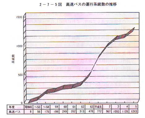 - 高速道路の伸長に伴い、高速バス網の拡充が進み、平成5年度末現在で全国で1,243系統が運行されるなど〔2−7−5図〕、国民の足として定着してきている。特に、夜行便を中心とした300キロ以上の長距離高速バスについては、昭和63年以降急速に路線網が拡大し、6年度末現在で168路線が運行されている。高速バスは夜間の時間を有効活用できること、鉄道・航空に比べ低廉な運賃であること等から、利用者に受け入れられているものと考えられるが、今後は、競合する交通機関との関係でバスの利点を更に発揮させるため、路線の再編成、車内の快適性の向上、利用しやすいターミナルの整備等を更に推進していくことが必要となっている。