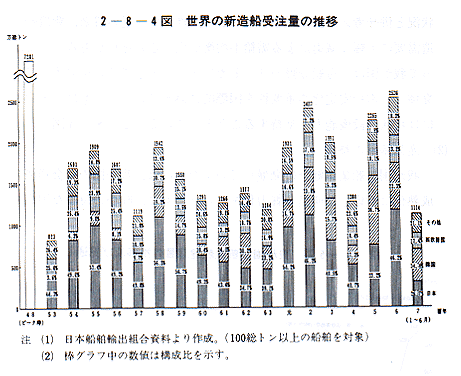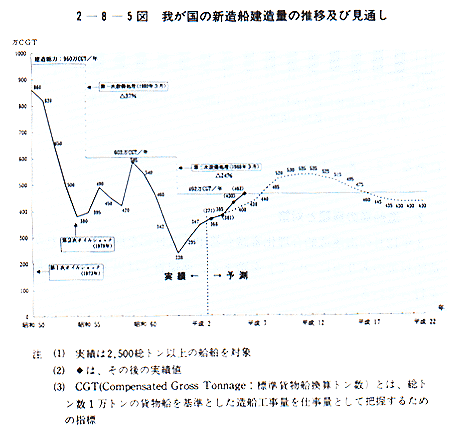 - 今後の世界の長期的な新造船建造需要は、基本的には21世紀始め頃に向けて増加、その後減少する傾向にあると予想される。他方、世界の供給能力は、韓国の大規模な設備拡張等により大幅な拡大傾向にあり、また、最近の新造船建造需要予測を上回るペースでの世界の建造状況と併せ考えれば、船腹過剰の解消は進まず、近い将来、新造船建造需要の大幅な減退による需給不均衡が生じるおそれがある。したがって我が国は、造船分野のリードカントリーとしてイニシアティブを発揮し、需給安定化の重要性を国際的に訴えていくとともに、国内的には現状の設備能力を堅持することとしている〔2−8−5図〕。