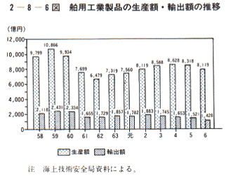 - 我が国舶用工業は、長期低迷を脱し緩やかな回復基調にあったが、円高等に起因する船価下落に伴う製品価格の低下により、生産額は減少している〔2−8−6図〕。