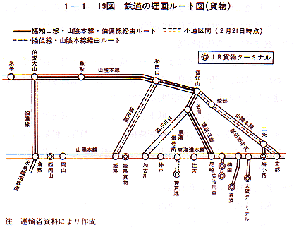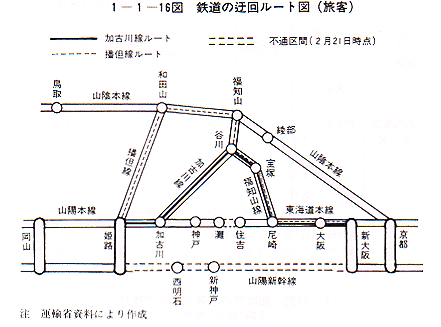 阪神・淡路大震災に伴う主な不通区間 (a)地震から一週間後(1月24日) (b)6月末現在