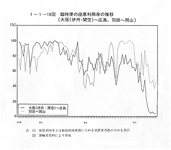 臨時便の座席利用率の推移〔大阪(伊丹・関空)〜広島、羽田〜岡山〕