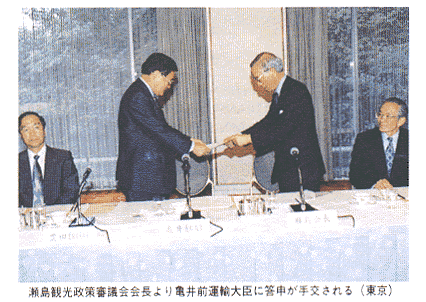 瀬島観光政策審議会会長より亀井前運輸大臣に答申が手交される(東京)