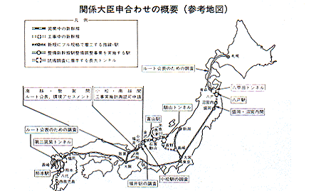 平成6年12月19日、整備新幹線の見直しについての関係大臣申合わせが締結され、@東北新幹線盛岡・八戸間のフル規格での着工、A北陸新幹線富山駅及び九州新幹線熊本駅での整備新幹線駅整備調整事業の実施、B長大トンネルの試掘調査への着手、C3線5区間以外の区間の整備のための「新しい基本スキーム」につき8年中に成案を得ること等について合意され、整備新幹線の整備の推進に大幅な前進を見ることとなった。これに従い、7年5月にはそれぞれ起工式等が行われた。