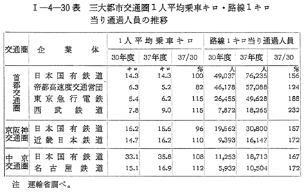 〔I−4−29表〕は,三大都市交通圏の都心流入人口の推移を示したものであるが,都心部における住宅難から居住地が都市周辺部に拡がつているため,三大都市交通圏全体でみると都心流入人口は昭和30年の124万人から35年には175万人と実に41%も増加し,三大都市交通圏内の人口全体に占める比重も4・9%から5.9%に上昇している。