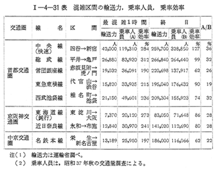 以上の輸送力増強とならんで既存の輸送力を有効に利用するために,時差出勤が35年の冬から国鉄によつて強力に提唱され相当の効果が挙げられたので,その後政府においてとりあげ年々強力,広範囲にこの時差出勤が推進され,39年1月末現在,東京では,協力官公庁,事業所,学校数は662カ所・協力人員40万6000人(前年比33%増)に達し、ラッシュピーク時の混雑はかなり平準化の動きがみられ,電車の遅延についても改善がみられた。しかし,この通勤時間帯の幅を拡げていくことには,官公署,会社,工場の勤務体制を大幅に変更しない限り限度があり,都市交通の根本的解決策とはならない。したがつて,通勤時間帯の幅を拡げる努力とならんで積極的に輸送力の増強を強力に推進する必要がある。