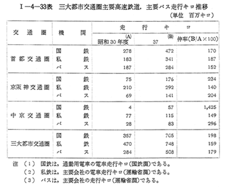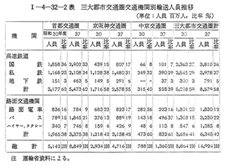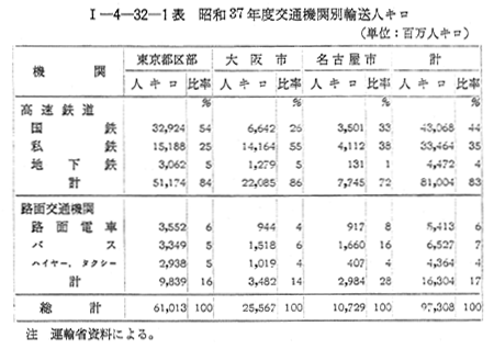 三大都市交通圏内の輸送人キロを交通機関別にみると, 〔I−4−32−1表〕のとおり各交通圏によつて差があるが,全体としては高速鉄道すなわち国鉄,私鉄,地下鉄の比重が圧倒的で全体の83%を占め,残りを路面電車,パス,ハィヤー,タクシーが輸送している。交通機関別の輸送人員の推移をみると, 〔I−4−32−2表〕のとおり,地下鉄,バス,次いで国鉄,私鉄の増勢が著しく,路面電車は絶対数では横ばいであるが全体に対する比重は大幅に減少している。地下鉄の伸びが著しいのは通勤通学輸送難改善のため大規模な地下鉄網建設が三大都市交通圏において進められている,ためであり,バスの増加原因は,人口増加が鉄道網の粗い中心都市周辺部に著しいので,これらの人々の輸送需要をまかなうために,バスが弾力的に最寄鉄道駅までのバス綱を形成していくためであろうと思われる。また,路面電車の減少傾向は路面混雑激化にともない速度低下が著しく,通勤交通機関としての機能が低下し,また,都心部には地下鉄の建設が意欲的に進められているためそれに乗客をうばわれたためと考えられる。