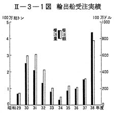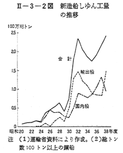 このような輸出船の受注状況の推移は,世界の海運市場の動向による外国船主の新造船建造意欲の消長を反映したものであるが,37,38年度において大量の輸出船の受注に成功したのは,29年度以来の船舶輸出の実績や自動化船および高経済性船の意欲的な開発によつて,わが国造船技術の優秀性が広く世界に評価されたうえ,わが国造船業が世界の海運市場の動向に適合するよう超大型船建造施設の整備を行ない,さらに船舶の建造コストの引き下げに成功し,世界の船主に魅力のある船舶を提供することができたことによるものである。また,輸出船の受注による新造船工事量を国内船の建造との関係でみると, 〔II−3−2図〕のとおりで,戦後19年間にわが国造船業でしゆん工した新造船量1996万総トンのうち,輸出船は1021万総トン,51%を占めており,その数量においても,輸出比率においても,造船業が輸出産業としての性格を強めてきたことを物語つている。