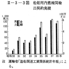 さらに,新造船の輸出とならんで,船舶用内燃機関の単体輸出契約は,ディーゼル機関を中心にして東南アジア,中南米向けを主体に,30年の13万馬九88万ドルから38年には10.9万馬力,587万ドルに達している 〔II−3−3図〕。