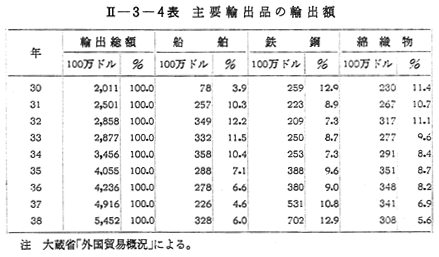 以上のような新造船および船舶用内燃機関の受注によつて,船舶関係の輸出額は通関ベースで 〔II−3−4表〕のように31年以降3億ドル前後に推移しており,鉄鋼,綿織物とならんでわが国の二大輸出品の一つとなつている。しかも船舶の外貨手取率は37年において油送船で84.5%と鉄鋼の68.0%,綿織物の56.1%にくらべてかなり高く,外貨獲得に果す役割はきわめて大きいものがある。さらに,39年3月末現在の輸出船手持工事量は,531万総トン,9億7000万ドルとなつており,今後期待される新規受注をあわせると39,40年度においても通関べースでみて38年度以上の輸出が約束されている。