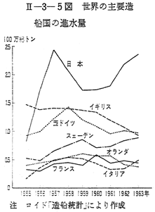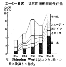 また世界の主要造船国における新造船受注量をみると 〔II−3−6図〕のように,わが国の受注量は1959,60,61年には世界の総受注量の25%程度であつたものが,1962年には35%程度になり,1963年には45%にも達し西欧造船国の受注量をはるかに上回つている。このようなわが国造船業の新造船受注における飛躍的な進出は,西欧造船国にわが国造船業に対する驚異の目を見開らかせると同時に,日本造船業恐るべしとの恐怖の念を抱かせることになつた。