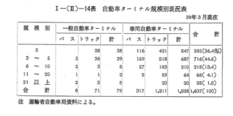 自動車ターミナルの整備の現況は 〔I−(II)−14表〕のとおりで,昭和39年3月末現在トラック・ターミナル1282カ所,バス・ターミナル325カ所である。トラック・ターミナルのうち,専用ターミナルが全体の94.5%を占めており,トラックターミナルの主体は専用ターミナルであることを示している。これらのトラック・ターミナルの大部分(79.0%)は5バース以下の小規模のものであるが,近年の路線トラック輸送需要の増大に伴い,逐次15バースないし20バースのものが増加しつつある。38年度中に完成したトラック・ターミナルは157カ所574バースである。