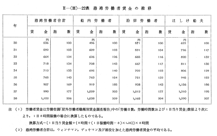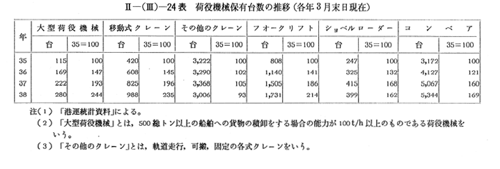 荷役機械については,移動式クレーンや大型荷役機械,フォークリフトやコンベア類の増加が目立っている。 〔II−(III)−24表〕,しかし,それにもかかわらず荷役の機械化は十分でない。船内荷役はほとんど機械化が進んでいないし,沿岸荷役機械についても最近整備の中心となっている移動式クレーンは,沿岸荷役事業者(約1300)1社当り1台にも満たない。