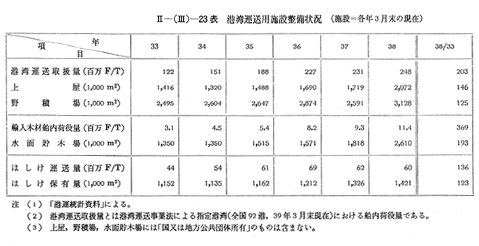 上屋,野積場,水面貯木場については,いまだ従前の投資不足を解消できず,水面貯木場については,輸入木材量の急増のため,主要港において依然として輸入量,輸入時期の調整,他港への回送等が行なわれているのが実情である。