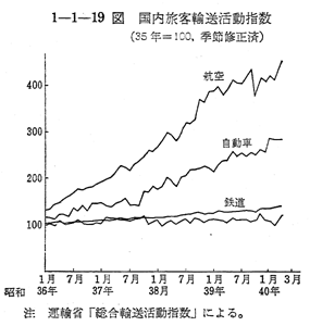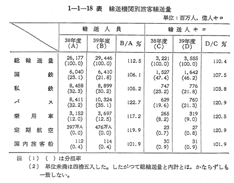 各輸送機関別にみると,まず国鉄については東海道新幹線の開業などにより,定期外輸送人員も,その1人平均乗車キロも増加し,また,通勤・通学客は依然として増大しているが,一方,オリンピック開催による客足の鈍化,定期1人平均乗車キロの減少等があつたため,全体としては人員,人キロともに38年度の対前年度伸び率を若干下回る伸びにとどまり,機関別分担率では低下の傾向にある。私鉄も輸送量では増加しているが,その伸び率は減少し,分担率は低下した。