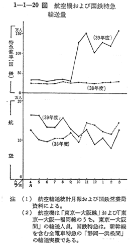 一方,東海道線における電車特急の輸送実績は,新幹線の開業を境にして急激に増加している。これは新幹線の誘発および急行列車などから新幹線への転移のほか,航空機からの転移も相当あるものと考えられる。