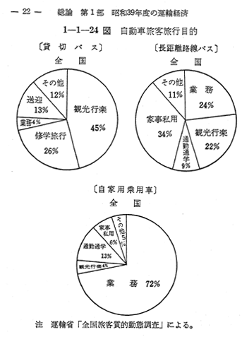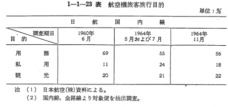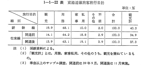 〔1−1−22表〕 〔1−1−23表〕,および 〔1−1−24図〕により示されるように用務旅客は,鉄道定期外旅客および航空旅客の中心であり,また,乗用自動車利用者の大半は用務旅客となつている。とくに昨年開業した東海道新幹線は,東海道沿線の用務旅行者にとつて便利なものとなつている。