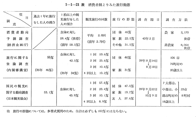 定期外旅客については,まず,観光旅客の増大があげられる。経済企画庁の「消費者動向予測調査」,内閣審議室の「旅行に関する世論調査」,および日本観光協会の「国民の観光に関する動向調査」により,消費者の側からみた過去1年間の観光慰安旅行の動態を見ると 〔1−1−21表〕のとおりであり,国民の相当数が,1泊以上の観光旅行をし,その旅行形態では,団体での旅行が多かつたことがわかる。このような輸送需要を反映して,その大半が観光目的に用いられる貸切バスの輸送人員は,対38年度比13%増の1億9,000万人となり,国鉄の周遊券の利用人員は,対38年度比9.1%増の480万人の実績をあげている。国内旅客船についても,別府航路のような観光路線においては,相当数の利用増がみられた。