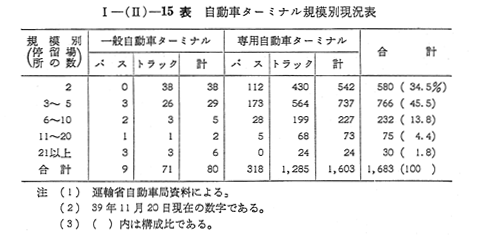 自動車ターミナル整備の現況は 〔I−(II)−15表〕のとおりで,昭和39年11月20日現在トラック・ターミナル1,356カ所,バス・ターミナル327カ所である。38年11月以後の1年間の推移をみると,一般バス・ターミナルは1カ所,車用トラック・ターミナルは77カ所増加しているが,専用バス・ターミナルは6カ所減少した。専用バス・ターミナルが減少したのは特に5バース以下の小規模のバス・ターミナルのうち,廃止されたものがあるためである。この結果,バス・ターミナルにおいては専用ターミナルのウェイトが若干低くなつたが,トラック・ターミナルにおいてはそのウエイトは高まつた。