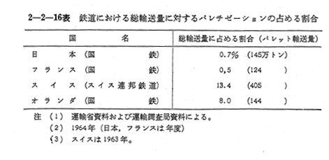 第3節 ユニットロードシステムの普及運輸近代化の一貫として輸送単位を合理的な大きさにまとめて輸送するユニットロードシステムが行なわれ,一貫パレチゼーション,コンテナリーゼーションとして普及されつつある。 パレチゼーションは包装経費の節減,機械荷役が可能であること,戸口から戸口ヘの輸送が実現できること等の利点をもつて欧州において盛んに行なわれている。鉄道における総輸送量に対するパレチゼーションの占める割合は 〔2−2−16表〕にみられるようにスイスが13.4%,と最も比重が大きく他は10%以内である。また,スイスにおけるパレットプール加入の企業数は1963年には3,210と1960年の1.5倍に増加している。しかし,一貫パレチゼーションの普及にはまだパレットの規格化,パレットプール制等の問題が残されている。