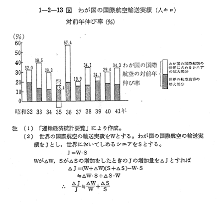 わが国の経済成長に伴う出入国旅客の増大,世界経済の繁栄による観光熱の高まりなどの需要増とわが国の国際航空の路線網の充実,国際競争力の強化により,41年のわが国の国際定期航空の輸送実績は旅客27億2,000万人キロ,貨物1億2,400万トンキロと前年に比べてそれぞれ34.3%,44.1%の増加であつた。わが国の国際航空旅客の伸びを過去10年間についてみると, 〔1−2−13図〕のとおりである。世界国際航空の伸び率は10〜20%と毎年大きな伸び率を示したが,わが国の国際航空の伸び率は35年を除いてそれを上回つたので,わが国の国際航空が世界において占めるシエアは増加の一途をたどり,40年にはIATA加盟100社中の日本航空(株)(輸送量等は 〔1−2−14表〕に示す。)のランキングは有償トンキロで第11位になつた。