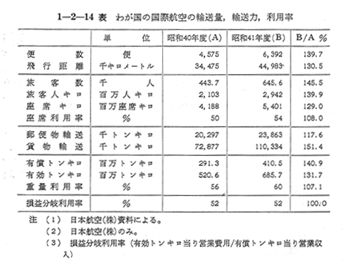 つぎに東京国際空港出入国旅客の動向をみると各国航空会社全体で24%の増加があつた。このなかで,日本航空(株)の横取比率は前年の29.4%から31.0%へと向上した。また,同空港の出入国貨物は4万1,000トンと対前年比46%の増加であつた。これは運賃値下げにより電子計算機,家庭電気機器,機械部品などの輸送が増大したこと,日米貿易が一般的に拡大したこと,ベトナム戦争の影響があつたことなどによる。同空港における日本航空(株)の航空貨物積取比率は25%程度であるため,わが国の航空貨物輸送体制の強化が検討されている。