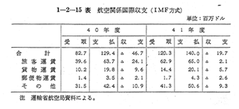 41年における航空関係国際収支は 〔1−2−15表〕のとおりである。旅客運賃の受取りが対前年度比59%の増加であつたため,従来2,000万ドル以上の赤字であつた旅客運賃収支が210万ドルの赤字に改善された。