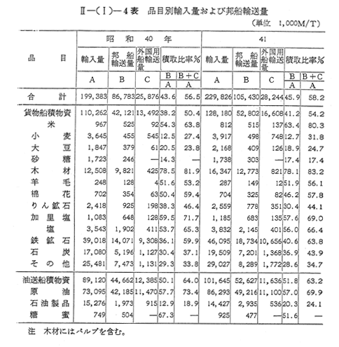 41年の輸送量は,外国用船を含めて6,553万トンで,40年より28.7%増加したが,このうち邦船輸送量は4,875万トン(輸出282万トン,輸入4,472万トン,三国間120万トン)で40年に比べ31.4%の著増を示した。これは専用船の大量建造の効果が現われてきたことを示すものであり,不定期貨物船の主な活動分野である輸入乾貨物の邦船積取比率は41.2%と40年より,3.0%の改善をみた。しかし,品目別の横取比率をみると( 〔II−(I)−4表〕)専用船の就航で改善されているとはいうものの,鉄鋼石,石炭の積取比率はいまだに乾貨物の平均横取比率を下回つており,また,小麦,大豆,砂糖等農産物の積取比率は著しく低く,この改善を図る必要がある。