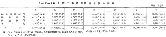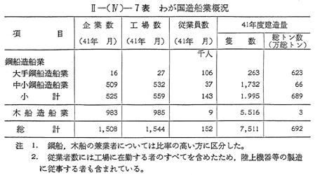 41年度のわが国造船業の実態は 〔II−(IV)−7表〕のとおり鋼船造船業者525社(うち大手造船業者16社)と木船造船業者938社からなり,その従業員数は鋼船造船業14万3千人,木造船9千人である。このうち主要造船所27工場のそれは10万6千人で38年度以降ほぼ横ばいで推移している。