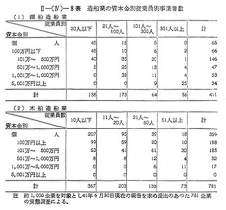 これらを資本金別,従業員数別に表せば 〔II−(IV)−8表〕のとおりであつて,鋼船造船業者は大手を除きその大部分が,また木船造船業者はその全てが中小企業である。