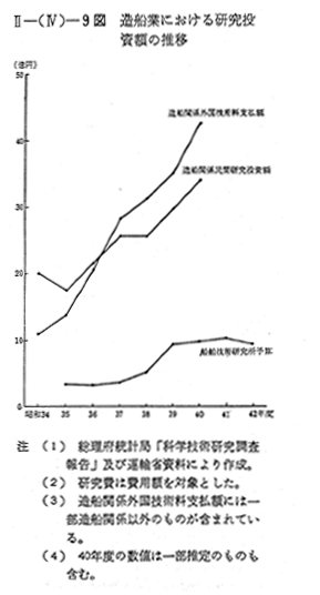 一方,造船業における外国技術料支払額は40年度においては,42億円であり,研究投資額の1.24倍にあたつているが,これは全企業の平均約0.28倍と比較するときわめて高い比率となつている。