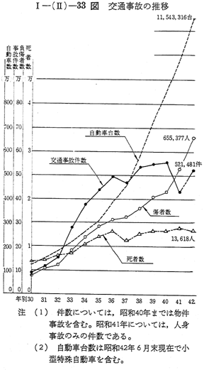 昭和42年中に全国の道路上で発生した交通事故(人身事故)件数は52万1,481件となつている。また,交通事故による死者数は1万3,618人,負傷者数砥65万5,377人となつており,依然として最悪の状態になつている。