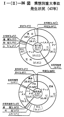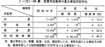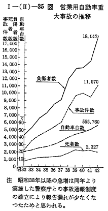 自動車の重大事故は 〔I−(II)−34表〕のように前年に比し,死者数,負傷者数および物的損害において前年より増加しており,事故による被害が大きくなつていることを示している。さらに,事故推移をみると 〔I−(II)−35図〕のとおりである。つぎに,これを事業の種類別にみると, 〔I−(II)−36図〕のように件数ではハイヤー・タクシー,次いでトラック,バスの順に多い。また,死者数ではトラック,次いでハイヤー・タクシー,バスの順に多い。次に,台数当りの発生件数でみるとハイヤー・タクシーが最も高く,1,000台当り27.7件であり,バスは2.8件,トラックは14.8件となつている。