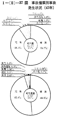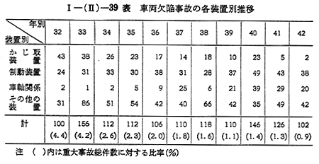 また,事故の種類別では 〔I−(II)−37図〕のとおり,衝突および死傷(通行人等当該自動車に乗車していない者を死傷させた事故)の2種類の事故で大多数を占めている。これらの事故の原因については 〔I−(II)−38図〕のように大半が直接的に当該車両の乗務員の不注意によつて惹起されたものである。なお,車両の構造的欠陥によつて起つた事故は0.9%となつている。 〔I−(II)−39表〕車両欠陥事故のうち,自動車の安全運行に最も重要な制動装置,かじ取装置の欠陥による事故が車両欠陥事故の3.9%を占めており,これらの装置に対する点検,整備等の一層の充実を図る必要がある。