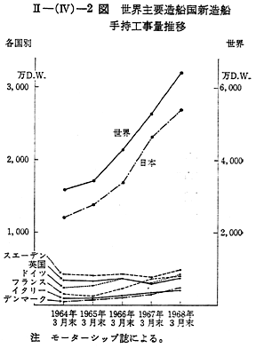世界の新造船手持工事量も進水量の伸びに伴つて,1964年以来大幅な増加傾向にある。英国のモーター・シップ誌の調査によると,1968年3月末現在では,6,416万重量トンに達し,史上最高を記録し,前年同期に比べ21%増加している。毎年3月末現在の主要造船国新造船手持工事量の推移は 〔II−(IV)−2図〕にみるとおりである。1968年3月末現在は各国とも手持工事量を一様に増加させているのは注目される。すなわち日本は対前年比16%増の2,694万重量トン,英国は23%増の380万重量トン,西ドイツは41%増の433万重量トン,スウェーデンは27%増の488万重量トンである。これら重量トン数の増加とは対照的に隻数は横ばい,ないしは減少しており,ここにも船型の大型化が如実に現われている。