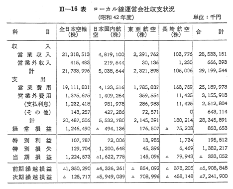 また,長崎を中心とするローカル線を運営してきた長崎航空(株)は前述のとおり42年11月をもつて定期運送事業部門を廃止したため,42年度は20%の収入減,24%の支出減となり,7,994万円の損失を計上して次期繰越損失は4億5,815万円となつた。同社は,42年12月以降不定期運送事業および航空機使用事業のみを行なつている。