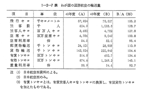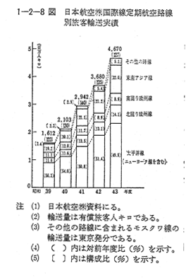 1 わが国国際航空の動向昭和43年の世界の国際航空輸送実績は,ICAO(国際民間航空機関)資料によれば旅客輸送量は5,500万人(対前年比8%増),1,140億人キロ(対前年比9%増)で,貨物輸送量は43億1,000万トンキロ(対前年比20%増),郵便物輸送量は10億5,000万トンキロ(対前年比17%増)と順調な伸びを示した。 一方,わが国の国際航空の昭和43年度の輸送実績は, 〔1−2−7表〕に示すとおり,旅客47億200万人キロ,貨物2億2,094万トンキロで,対前年度比でそれぞれ27.8%増,54.6%増となり,ここ数年来大幅な伸びを持続し,とくに貨物輸送の伸びは旅客輸送の伸びをさらに大きく上回つた。43年度のわが国の国際路線拡充,増便状況をみると,7月にニューヨーク・パリ線,8月に南回り欧州線のベイルート寄航,9月にバンクーバー線等を開始し,太平洋線で42年度の週27往復から43年度は週37往復(いずれも旅客便)に増便したのをはじめ,各路線とも大幅な増便を行なつた。わが国の国際航空輸送量を路線別にみると,旅客輸送では 〔1−2−8図〕に示すように太平洋線(ニューヨーク線を含む)のシエアは約50%を占めているが,その割合は年々減少の傾向にあり,一方東南アジア線のシエアは年々増加し,43年度で22.0%を占めるにいたつた。また北回り欧州線シエアも順調に伸びている。貨物輸送では,どの路線も大幅に伸びてきているが,特に70%近いシエアをもつ太平洋線の伸びは著しく,43年度で対前年度比70%増の伸びを示した。 このようにわが国の国際航空が伸びてきたのは,旅客輸送においては日本航空の路線拡充,増便,安全運航に対する努力,内外航空客の吸引努力が実つたからであると考えられるが,わが国のめざましい経済発展に伴つて,政治,経済,文化等の国際交流の活発化,国民所得水準の向上によるレジャーの多様化,国際化によるところが大きい。また国際航空貨物の急激な伸びは,航空機の大型化,ジエツト化等による輸送能力の増加と,それに伴う輸送コストの低減および運賃の低下など輸送条件が改善されたことに加えて,航空輸送によるスピード輸送のもつ直接,間接的なメリツトが,近代的な輸送需要にマツチしてきたことによるところが大きい。このことは,航空貨物の内容が,従来は貴重品とか緊急輸送を要する特殊商品に限られていたのが,現在では輸送機器類,機械類,織物類,衣料等,多様化してきたことからもうかがえる。 近年世界の国際航空は,めざましい技術革新による輸送力の増強と,急膨張した航空旅客輸送需要の増大に支えられて急速な発展を遂げてきたが,それとともに,各国の航空企業間での競争は,激化の一途をたどつている。42年日本航空はIATA(国際航空運送協会)加盟の航空会社のなかで8位となり,著しい躍進を示したが,42年以来航空界に大きな話題をなげかけた,いわゆるパシフィツクケース(米国航空会社の太平洋航空路線の新規免許問題)にみられるように,わが国も激化する国際競争のなかできびしい試練の前に立たされている。このパシフィックケースの実現で,米国の大手航空会社が新規乗り入れを含む大量増便をすることになれば,それがジャンボジェット機等新鋭機の登場と重なつて,太平洋路線は供給過剰の状態になり,ますます競争が激化することになり,わが国航空企業はきびしい立場におかれることはさけられない。今後わが国航空企業が国際競争のなかで優位にたつためには,路線網および運航回数の拡充,新鋭機材の投入のみならず,大量販売対策,地上受入れ施設の整備,貨物集配機構の強化等の対策が必要である。