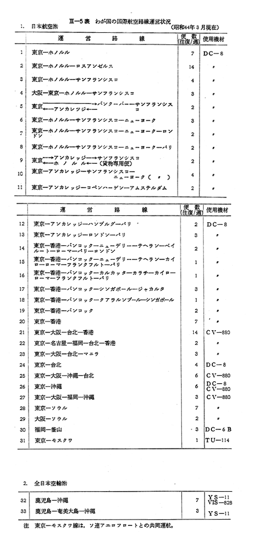 昭和44年3月現在のわが国の国際路線運営状況は, 〔III−5表〕のとおり33路線週128往復で,前年同期に比べると5路線,34往復の増加となつている。これは43年度に東京――バンクーバー線,ニューヨーク――パリ線が開設されたのを初めとして路線構成の多様化が図られるとともに太平洋線東南アジア線等で大幅な増便が行なわれた結果である。
